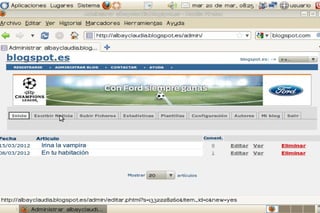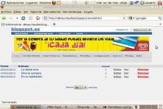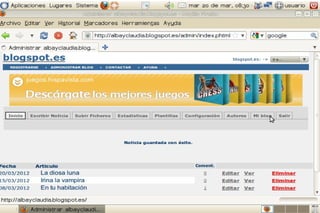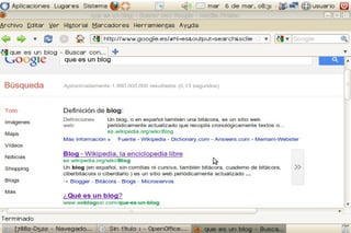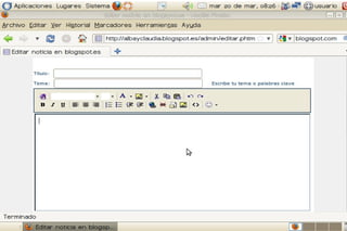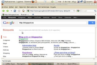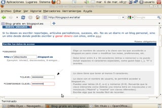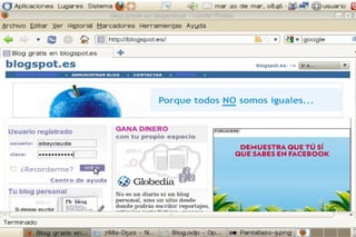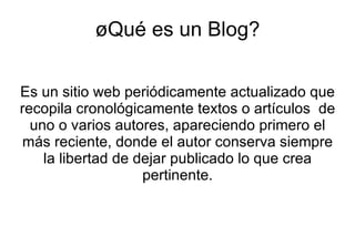 Un blog es un sitio web periódicamente actualizado donde uno o varios autores publican artículos de forma cronológica. Los blogs gratuitos más populares son Blogspot.es y www.blogger.com. Para crear una cuenta, el usuario se registra proporcionando su correo electrónico y confirma la cuenta a través de un enlace de verificación. SlideShare permite a los usuarios compartir presentaciones de diapositivas de PowerPoint u otros formatos de manera pública o privada.