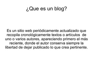 Este documento explica los pasos para crear un blog gratuito utilizando Blogger o Blogspot. Describe cómo registrarse para obtener una cuenta de Google, completar los detalles personales, editar el diseño y perfil del blog, publicar entradas con texto e imágenes, aplicar un fondo y añadir gadgets como una cabecera y una dirección.