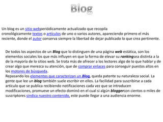 Un blog es un sitio web actualizado periódicamente que presenta artículos en orden cronológico de más reciente a más antiguo. Los blogs se caracterizan por su naturaleza social, permitiendo a los lectores suscribirse para recibir notificaciones y añadir comentarios, y por tener un enfoque en generar discusión más que en obtener enlaces. Un blog típicamente tiene elementos como entradas, comentarios, enlaces a otros blogs, y una clasificación por fecha o tema.