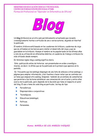 El documento habla sobre los blogs o bitácoras. Explica que un blog es un sitio web actualizado periódicamente que recopila artículos de uno o más autores de forma cronológica. Los blogs permiten comentarios de lectores y enlaces a otros blogs y páginas web. Hay blogs personales, de empresas, tecnológicos, educativos y políticos. También describe características como su interactividad, elementos como comentarios y enlaces, y herramientas para crear y mantener blogs de forma gratuita o mediante software.