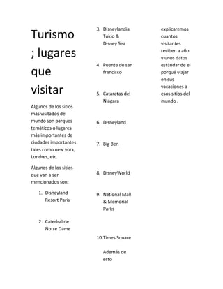 Los lugares más visitados del mundo incluyen parques temáticos como Disneylandia y Disney Sea en Tokio, así como atracciones famosas como el Puente de San Francisco, las Cataratas del Niágara, Disneyland, Big Ben, DisneyWorld, el National Mall y Memorial Parks en Washington D.C., y Times Square en Nueva York. El documento también menciona que proporcionará datos sobre la cantidad de visitantes anuales que reciben estos sitios populares.
