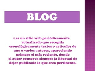 El documento habla sobre blogs. Explica que un blog es un sitio web periódicamente actualizado que recopila artículos de uno o más autores en orden cronológico, con las publicaciones más recientes primero. Además, menciona que los blogs son gestores de contenido pequeños, de bajo costo o gratuitos, fáciles de configurar y que requieren poco o ningún conocimiento técnico para publicar. Finalmente, el documento proporciona ejemplos de blogs creados por profesores y estudiantes para apoyar las clases de len