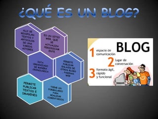 Este documento resume la historia y evolución de los blogs desde 1994 hasta la actualidad. Justin Hall creó el primer blog, Links.net, en 1994. En 1999, Blogger se convirtió en una de las primeras plataformas para crear blogs. Hoy en día, existen cientos de plataformas para blogs personales, corporativos y de otros tipos como vlogs, fotoblogs y más. Los blogs se han convertido en una herramienta popular de comunicación y expresión en internet.