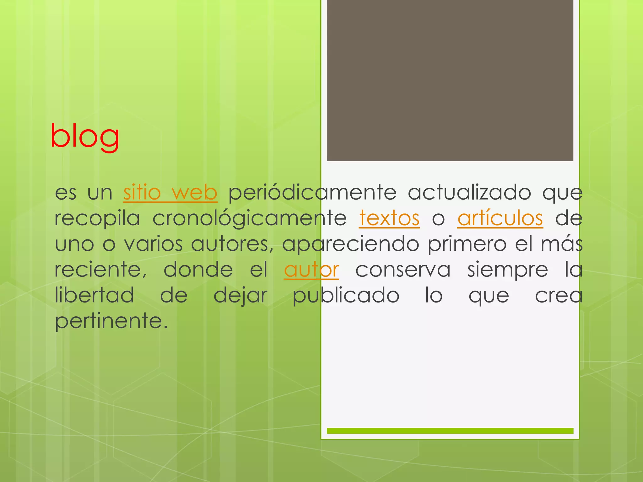 Un blog es un sitio web periódicamente actualizado que recopila cronológicamente textos o artículos de uno o varios autores, apareciendo primero el más reciente, donde el autor conserva la libertad de publicar el contenido que considere pertinente.