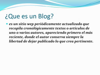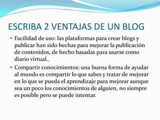 Un blog es un sitio web actualizado periódicamente que presenta artículos en orden cronológico del más reciente al más antiguo. Ofrece dos ventajas: facilidad de uso y compartir conocimientos, pero también dos desventajas: frustración por falta de interés y tener que lidiar con trolls. Los blogs sirven para buscar trabajo, estudiar y mejorar en el puesto laboral. Crear un blog implica elegir un nombre de dominio, hosting, instalar WordPress, elegir una plantilla, plugins y luego generar tráfico y monetizarlo.