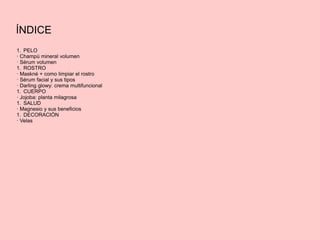 El documento describe una variedad de productos de cuidado personal, incluyendo champús en polvo, serums para el cabello y productos para el cuidado de la piel que abordan problemas como el 'maskné'. Se enfatiza la importancia de mantener una rutina de cuidado que incluya limpieza, hidratación y aplicación de productos específicos, como sérums faciales y cremas nutritivas. Además, se menciona la relevancia de vitaminas y magnesio para la salud general, sugiriendo el uso de complementos alimenticios para cubrir deficiencias.