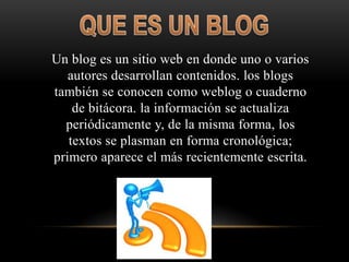 Un blog es un sitio web donde autores publican contenido de forma periódica y cronológica. Los blogs tienen múltiples usos como buscar trabajo, estudiar con compañeros y profesores, enviar trabajos a profesores, e ideas para mejorar el lugar de trabajo. Para crear un blog se debe elegir un tema de interés, seleccionar una plataforma, diseñarlo atractivamente, escribir contenido regularmente y promoverlo en la comunidad de blogs.