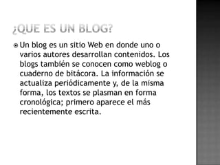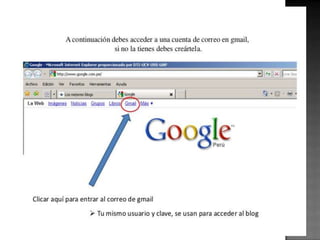 El documento habla sobre blogs y cómo crear una cuenta de Google. Explica que un blog es un sitio web donde autores publican contenido de forma periódica y cronológica. Luego, detalla los pasos para crear una cuenta de Google, que incluyen ingresar a Google, hacer clic en "crear cuenta", contestar un cuestionario y completar la información requerida.
