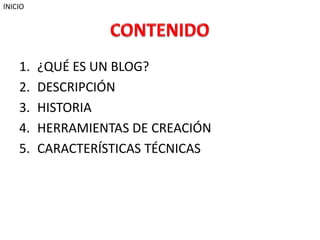 El documento describe qué es un blog, su historia y características. Un blog es un sitio web actualizado periódicamente que recopila cronológicamente textos o artículos de uno o más autores, donde los lectores pueden comentar y el autor responder. Antes existían comunidades digitales como listas de correo y foros, que posibilitaron conversaciones sobre temas específicos. Los blogs pueden tratar diferentes temas y permiten comentarios, enlaces, fotos y videos.