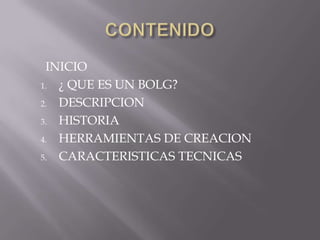 Este documento define un blog, describiendo que es un sitio web actualizado periódicamente que recopila artículos de uno o más autores de forma cronológica, con el más reciente primero. Explica que los blogs permiten comentarios de lectores y respuestas del autor, y que existen blogs con diferentes temas como noticias, negocios, tecnología, educación y política. También lista algunas herramientas para crear blogs y características comunes como comentarios, enlaces e inclusión de fotos y videos.