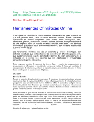 Las herramientas ofimáticas online permiten crear, modificar y procesar una variedad de documentos como textos, hojas de cálculo, presentaciones y más desde cualquier lugar. Algunos ejemplos populares son Google Docs, Zoho y ThinkFree Online, que ofrecen suites completas de herramientas de productividad en línea de forma gratuita. Estas herramientas proporcionan ventajas como la colaboración en tiempo real y el almacenamiento en la nube de archivos.