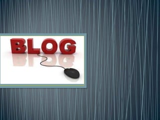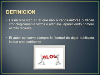 Este documento describe las características principales de un blog. Un blog es un sitio web en el que uno o más autores publican artículos de forma cronológica. Los blogs permiten tener una presencia en Internet para ofrecer productos o servicios, y también establecer marketing personal o empresarial. Los usuarios pueden añadir metadatos, comentar artículos, y suscribirse para recibir las últimas actualizaciones. Existen diferentes tipos de blogs como personales, corporativos, educativos o de microblogging.