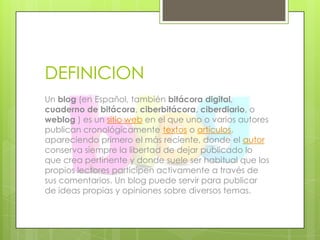 Este documento define un blog como un sitio web en el que uno o más autores publican artículos de forma cronológica. Explica que los blogs permiten publicar ideas y opiniones, y que son una herramienta importante para mejorar la comunicación entre empresas, instituciones o particulares y sus clientes u otros usuarios. Finalmente, resume algunas características clave de los blogs como su facilidad de uso, la capacidad de incluir diferentes tipos de contenido multimedia, y las funciones de comentarios, suscripciones y enlaces.