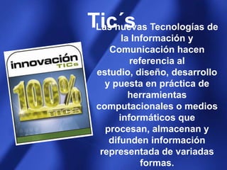Este documento describe las tecnologías de la información y la comunicación (TIC) y cómo se pueden usar en la educación. Explica conceptos como la Web 2.0, que permite a los usuarios controlar y compartir información a través de aplicaciones interactivas y redes sociales. También describe herramientas como los blogs, wikis y edublogs, que permiten publicar contenido en línea de forma colaborativa y son útiles para complementar la enseñanza entre el profesor y los estudiantes. El documento proporciona enlaces para crear