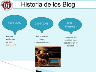 Este documento habla sobre los blogs. Explica que un blog es un sitio web actualizado periódicamente que recopila artículos de uno o más autores en orden cronológico, permitiendo que los lectores comenten. También describe algunos usos comunes de los blogs como diarios personales, para opinar o enseñar, y las ventajas de usar blogs en el aula, como apoyar materiales audiovisuales y colaborar.