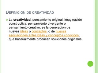 Este documento define la creatividad como la generación de nuevas ideas o conceptos a través de nuevas asociaciones entre ideas conocidas, lo que habitualmente produce soluciones originales. Explica que las personas creativas suelen tener confianza, flexibilidad, imaginación, curiosidad y entusiasmo. Finalmente, resume que las claves para potenciar la creatividad son buscar un elemento apasionante, trabajar constantemente con planificación y riesgo, y salirse de la zona de confort.