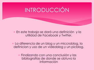 Este documento define y explica el uso de varias redes sociales como Facebook, Twitter, blogs, microblogs, videoblogs y picblogs. Describe las diferencias entre blogs y microblogs, y explica cómo se usan videoblogs y picblogs. Finalmente, concluye que aunque las redes sociales tienen usos positivos como mantenerse en contacto con otros, también tienen riesgos como el acceso fácil a la información personal de las personas.