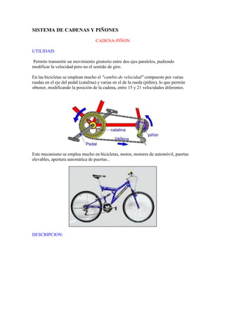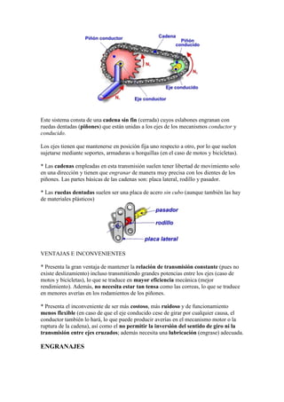 Este sistema permite transmitir movimiento giratorio entre ejes paralelos o perpendiculares mediante engranajes dentados. Se utiliza comúnmente en bicicletas, motos y automóviles. Presenta la ventaja de mantener la relación de transmisión constante incluso transmitiendo grandes potencias, pero tiene el inconveniente de ser más costoso y ruidoso que otros sistemas.