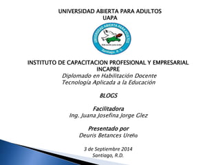 Este documento describe los blogs y su uso en educación. Explica que un blog es un sitio web que recopila artículos de uno o más autores de forma cronológica, y donde los lectores pueden comentar. También señala que los blogs educativos, o edublogs, son fáciles de usar, gratuitos y permiten la publicación de contenido de diversas fuentes para apoyar el aprendizaje.