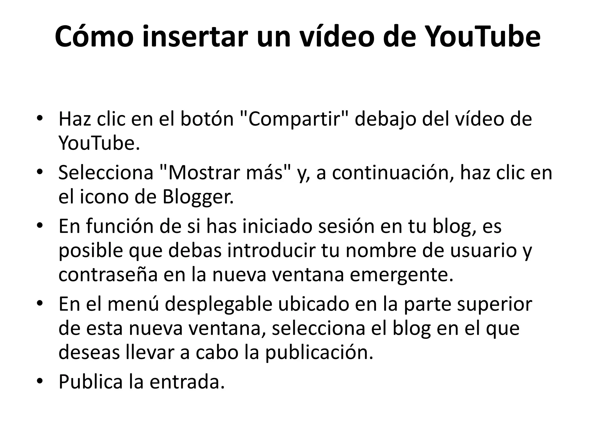Este documento proporciona instrucciones sobre cómo insertar un video de YouTube, una presentación de diapositivas y una imagen en un blog usando Blogger. Explica los pasos para compartir un video de YouTube, enlazar y embeber un álbum de fotos, y cargar e insertar una imagen.
