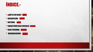 Este documento define y describe los blogs y el microblogging. Explica que un blog es un sitio web donde los autores publican artículos de forma cronológica y los lectores pueden comentar. También describe la historia de los blogs modernos y cómo evolucionaron de los diarios en línea personales. Además, distingue entre blogs personales y corporativos y explica que el microblogging permite compartir breves actualizaciones de texto, imágenes y enlaces.