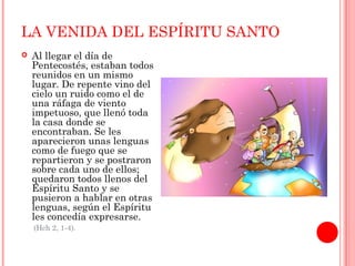 El documento describe la venida del Espíritu Santo en Pentecostés. Describe cómo los apóstoles recibieron lenguas de fuego y comenzaron a hablar en otras lenguas. Explica que el Espíritu Santo es la tercera persona de la Trinidad y llena a los creyentes con el amor de Dios. También enumera los dones del Espíritu Santo como la sabiduría, fortaleza y entendimiento.
