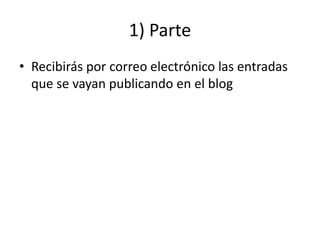 El documento explica los beneficios de suscribirse a un blog, incluyendo recibir por correo electrónico las nuevas entradas publicadas en el blog, recibir un boletín, y recibir un email con las mejores historias del blog.