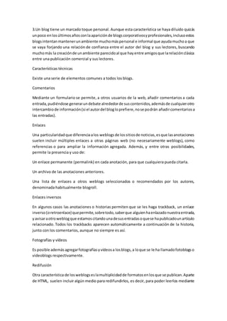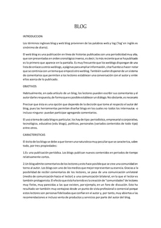 Este documento describe los blogs, incluyendo su historia, objetivos, características y tipos. Los blogs son publicaciones en línea que presentan contenido en orden cronológico inverso. Suelen permitir comentarios de lectores y enlaces a otros blogs y páginas. Existen blogs personales, corporativos, educativos y de diferentes temas como política, salud y viajes. Las características incluyen comentarios, enlaces, fotografías, videos y formatos de redifusión.