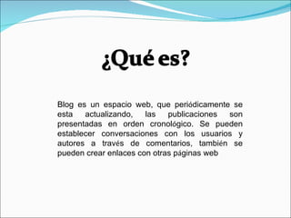 Este documento proporciona instrucciones paso a paso para crear un blog usando la plataforma Blogger.com. Explica cómo registrarse en Blogger, elegir un nombre y diseño para el blog, agregar entradas de blog con texto, imágenes y enlaces, y personalizar la apariencia y configuración del blog. El objetivo final es ayudar al lector a establecer su propio blog para compartir contenido.