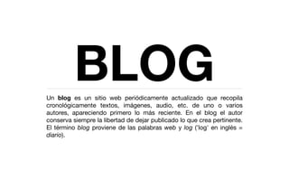 Un blog es un sitio web que recopila cronológicamente textos, imágenes u otros contenidos publicados por uno o más autores. Los blogs permiten a los lectores comentar los artículos y establecer diálogos. Existen herramientas gratuitas que facilitan la creación y administración de blogs de manera sencilla.