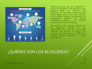 El documento habla sobre blogs, blogueros y cómo crear un blog. Explica que los blogueros pueden ser de cualquier edad, nivel educativo o profesión y escribir sobre cualquier tema que les interese. También da consejos sobre elegir un tema para el blog, publicar con regularidad, y diseñar el blog dependiendo del servicio de alojamiento elegido.