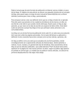 Este documento ofrece una introducción al concepto de blog. Explica que un blog es similar a un cuaderno de bitácora de un barco, donde se escribe un diario en línea de forma periódica. Los blogs pueden ser personales o participativos. Se definen los blogs como una evolución de las páginas personales de la Web 2.0, que publican diferentes tipos de artículos de forma cronológica, con los más recientes en la portada.