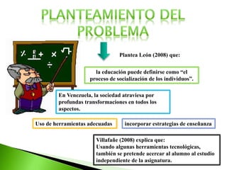 Este documento presenta el diseño e implementación de un blog educativo para la asignatura de introducción a la computación en la Universidad Fermín Toro, con el objetivo de apoyar la enseñanza presencial y mejorar el rendimiento académico de los estudiantes. Se destaca el uso de herramientas tecnológicas para fomentar el estudio independiente y abordar dificultades en el aprendizaje, especialmente en matemáticas. La investigación se basa en un enfoque cuantitativo y utiliza entrevistas y cuestionarios para identificar debilidades y áreas de mejora en los estudiantes.