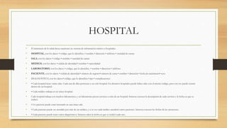 El documento describe los requisitos para un sistema de información para hospitales que almacenará datos sobre hospitales, salas, médicos, laboratorios, pacientes y diagnósticos. Cada entidad tendrá un código identificador y otros atributos relevantes. Los hospitales tendrán salas y trabajarán con varios laboratorios. Los pacientes serán asignados a salas y podrán ser atendidos por varios médicos y tener múltiples diagnósticos. El sistema registrará las fechas de los eventos médicos de cada paciente.