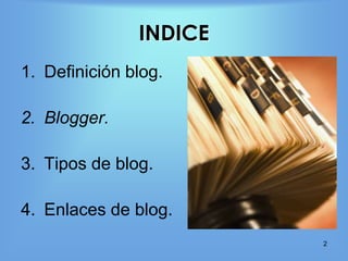 Este documento define qué es un blog, explica que proviene de las palabras "web" y "log" y se refiere a los antiguos cuadernos de bitácora. Explica que Blogger es un servicio para crear y publicar blogs en línea y menciona diferentes tipos de blogs como los temáticos, personales, colaborativos, audioblogs y fotologs. Finalmente, incluye algunos enlaces de ejemplo a blogs.