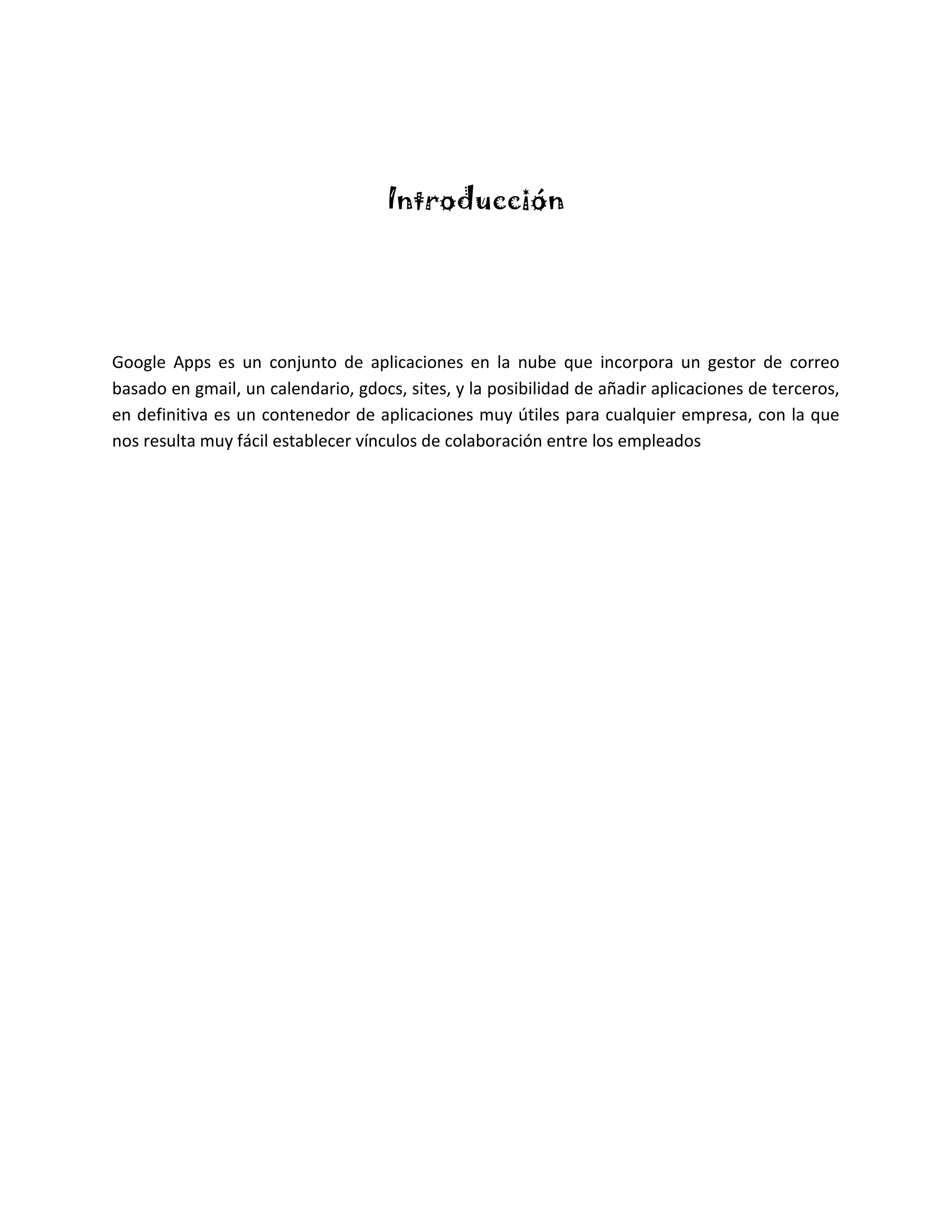 El documento describe las características y aplicaciones de Google Apps. Google Apps es una solución de comunicación y colaboración en la nube que incluye Gmail, Google Calendar, Google Docs, Google Sites y la capacidad de agregar aplicaciones de terceros. Proporciona acceso a aplicaciones desde cualquier dispositivo y permite compartir información y colaborar fácilmente entre empleados.