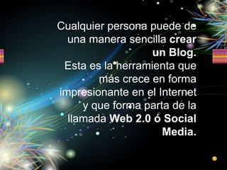 Un blog es una publicación en línea que permite a cualquier persona publicar contenido de manera periódica y en orden cronológico inverso sobre un tema de interés. Los blogs pueden ser personales, temáticos o empresariales y sirven como un foro para compartir ideas, sentimientos y comentarios. No requieren conocimientos técnicos avanzados para crearse y pueden usarse para establecer diálogos y debates con miles de lectores.