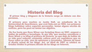 El primer blog de la historia fue creado en 1994 por Justin Hall como un diario personal en línea llamado links.net. Sin embargo, muchos consideran que el primer blog real fue Scripting News creado en 1997 por Dave Winer, ya que fue el primero en tratar temas de actualidad y tecnología más allá de la vida personal del autor. Un blog es un sitio web que muestra contenidos actualizados de forma frecuente en orden cronológico inverso, permitiendo a los lectores comentar. Existen blogs personales, corporativos y temáticos.