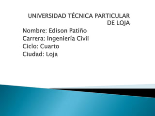 El documento presenta información sobre un estudiante de ingeniería civil de cuarto ciclo de la Universidad Técnica Particular de Loja. Describe los blogs como una herramienta de la web 2.0 que permite publicar conocimiento y experiencias de manera sencilla, la cual se puede crear gratis en WordPress de manejo sencillo sin costos de mantenimiento y que trabaja con otras herramientas para publicar información de forma simple, resultando útil para la gestión del conocimiento.