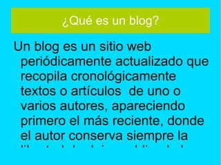 Este documento resume diferentes tipos de herramientas digitales como blogs, Slideshare y Calaméo. Un blog es un sitio web periódicamente actualizado que recopila artículos de uno o más autores de forma cronológica. Slideshare permite compartir presentaciones en línea de forma pública o privada. Calaméo es una plataforma gratuita para crear revistas y folletos digitales a partir de documentos PDF.