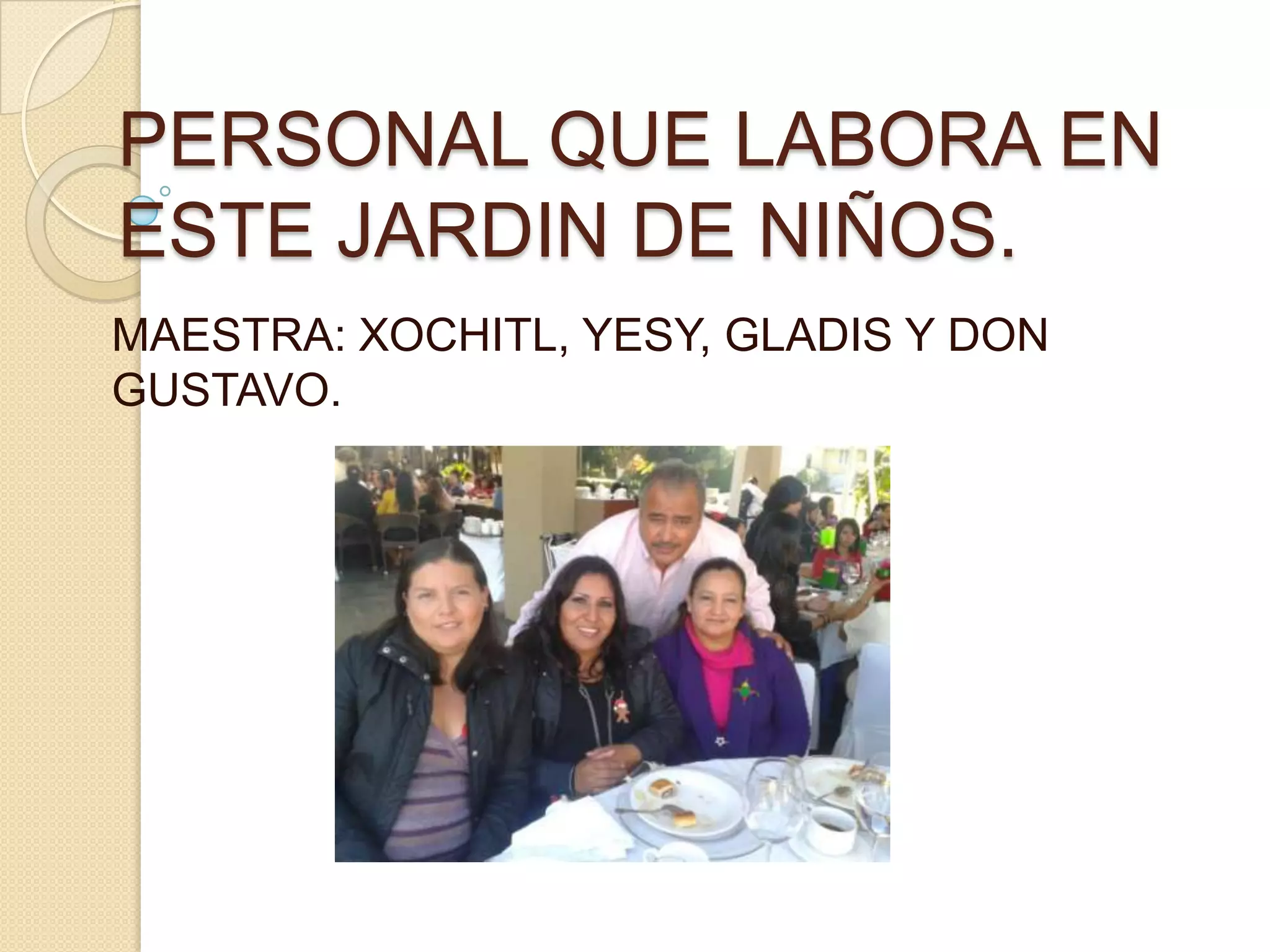 Este documento presenta la información sobre el personal, misión, objetivos y actividades de un jardín de niños. Las maestras son Xochitl, Yesy, Gladis y Don Gustavo. Los objetivos de la educación preescolar incluyen el desarrollo de habilidades sociales, lenguaje, matemáticas y artísticas. El jardín realiza diversas actividades para fomentar los campos formativos en los niños.