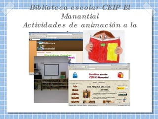 El documento describe las actividades de animación a la lectura realizadas en la biblioteca escolar CEIP El Manantial, incluyendo la creación de un blog, concursos, guías de lectura y recomendaciones de libros. Más adelante, se propuso crear un periódico escolar digital para fomentar la lectura y escritura entre el alumnado, aprovechando las ventajas de no requerir gastos de impresión y estar siempre actualizado. El periódico se elabora con las contribuciones del alumnado enviadas por correo electrónico