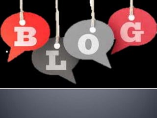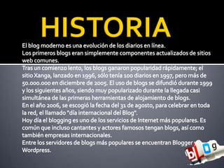 El documento describe los pasos para crear un blog. Estos incluyen registrarse, completar el procedimiento de inscripción, crear el blog con un nombre, dirección y plantilla, y luego tener la opción de editar y publicar el blog.