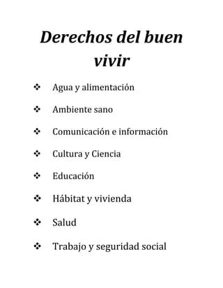 El documento describe los derechos fundamentales del buen vivir en Ecuador, incluyendo el derecho al agua, alimentación, ambiente sano, educación y más. También describe los elementos constitutivos del Estado ecuatoriano como un Estado social, democrático y plurinacional. Finalmente, enumera los objetivos del buen vivir como la igualdad social, calidad de vida, soberanía, trabajo digno, y establecer un sistema económico social y sostenible.