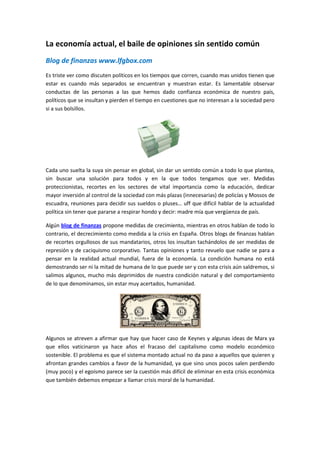 El documento critica la división y egoísmo que prevalece en la política actual, donde los políticos se centran en disputas personales en lugar de abordar las necesidades de la sociedad. Diversos blogs de finanzas ofrecen opiniones contradictorias sobre el crecimiento y el decrecimiento económico, reflejando la confusión y falta de consenso en torno a la crisis. Además, se menciona que el sistema actual obstaculiza cambios positivos, sugiriendo que los conflictos morales son tan relevantes como los económicos en esta crisis.
