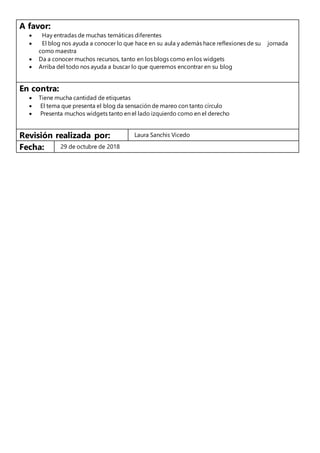 Este documento resume un blog educativo sobre educación infantil. El blog ha publicado regularmente desde 2011, con más de 100 entradas por año en algunos años. El blog cubre varios temas educativos y comparte recursos. El blog permite comentarios y usa una licencia Creative Commons, pero no ofrece suscripción. La revisora encuentra que el blog es útil para conocer las actividades del aula, pero que tiene demasiadas etiquetas y widgets.