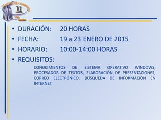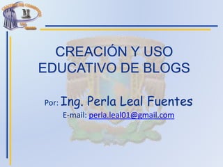 Este documento describe un curso de 20 horas sobre la creación y uso educativo de blogs. El curso enseñará a los participantes a crear un blog usando Blogger que puedan usar como recurso de apoyo en el aula. Los temas incluyen el uso de la Web 2.0 en educación, crear cuentas de Gmail y Google Drive, y compartir archivos, videos y presentaciones. El objetivo es que los participantes aprendan a crear un blog educativo sobre la materia que imparten.