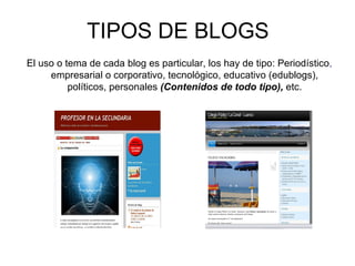 Un blog es un sitio web actualizado periódicamente que recopila artículos de uno o más autores de forma cronológica. Existen blogs periodísticos, empresariales, tecnológicos, educativos y personales. Los blogs educativos tienen como objetivo reforzar el proceso de enseñanza y aprendizaje, permitiendo la construcción de la identidad del autor, la organización de la información, el fomento del debate a través de comentarios y la creación de comunidades de aprendizaje.