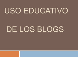 Este documento describe el uso educativo de los blogs (edublogs) en tres oraciones. Explica que los edublogs son webs cuyo objetivo principal es apoyar procesos de enseñanza-aprendizaje, y ofrecen ventajas como facilidad de uso, gratuidad, autoría compartida e interactividad. Además, enumera usos educativos como la organización del discurso, el fomento del debate y la construcción de identidad como autor, y propone una alfabetización digital crítica y reflexiva a través de metodologías