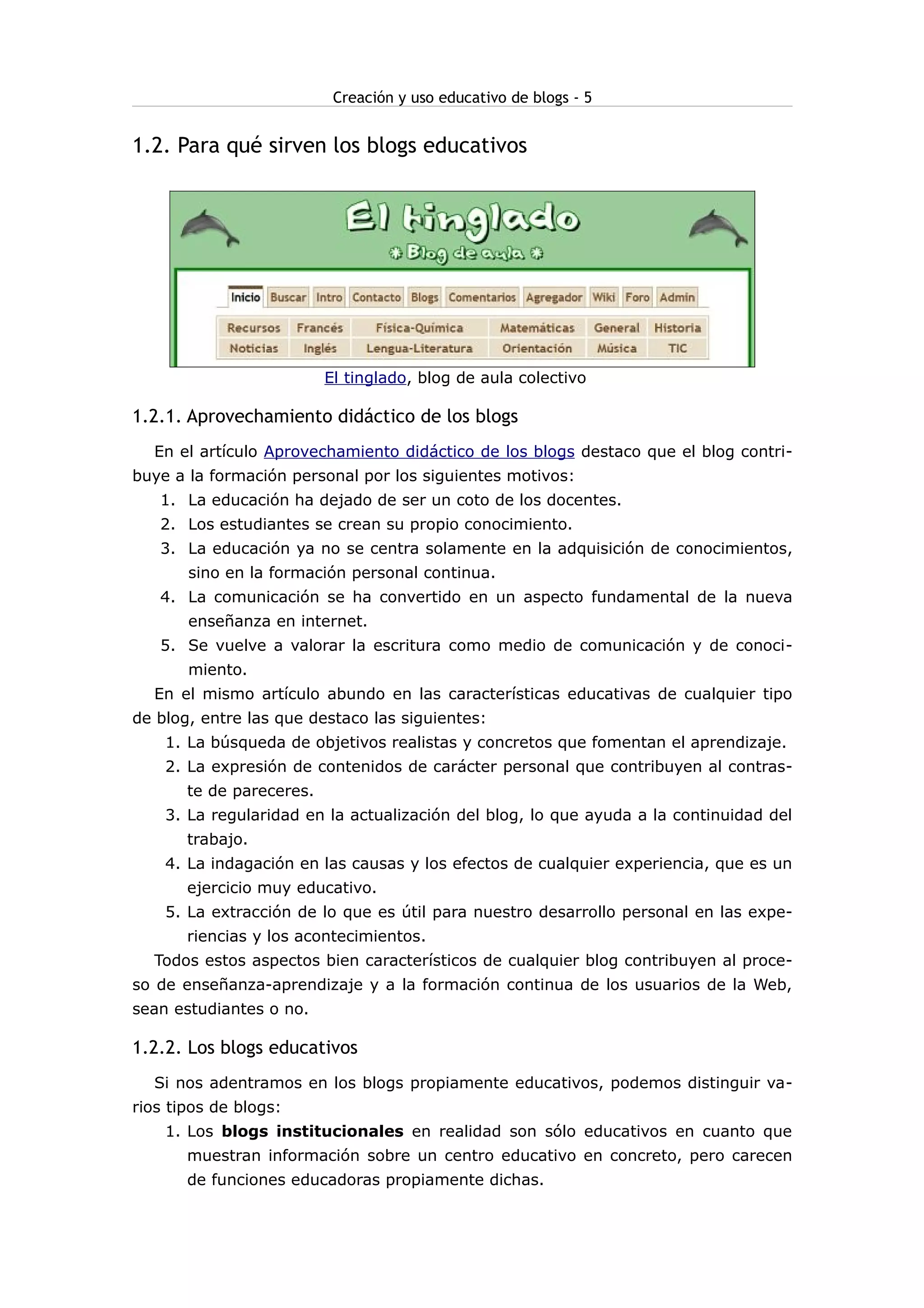 El documento describe los tipos y usos educativos de los blogs. Explica que los blogs educativos pueden ser institucionales, de profesores, de estudiantes o de aula colectivos. Los blogs de aula buscan utilizar Internet con fines educativos, fomentar la escritura y colaboración, proponer nuevas formas de evaluación, y conocer la sociedad de la información. El documento también detalla algunas actividades que se pueden realizar en los blogs de aula como publicar actividades interactivas y facilitar la libre expresión y adquis